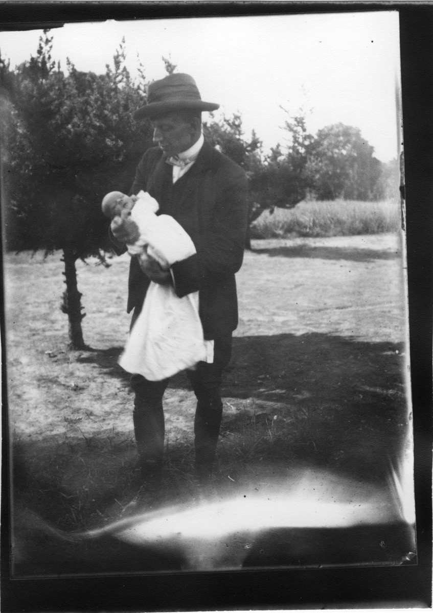 'Diverse fotografier från bl.a. dåvarande Nordrhodesia, nu Zambia, tagna av Konsul Magnus Leijer. :: :: En man ståendes på en gräsmatta med en bebis i famnen. Bakom dem är träd synliga.'