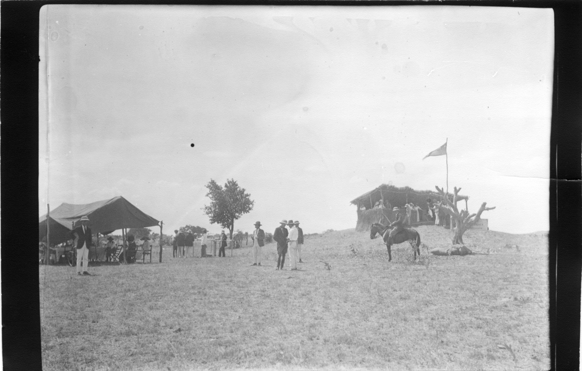 'Diverse fotografier från bl.a. dåvarande Nordrhodesia, nu Zambia, tagna av Konsul Magnus Leijer. :: Ett flertal män och kvinnor i och kring enkla uppbyggda solskydd på öppen plats, en man till häst. Det hela fotograferat från avstånd.'
