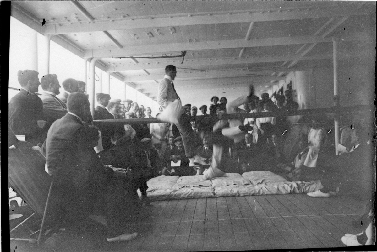 'Diverse fotografier från bl.a. dåvarande Nordrhodesia, nu Zambia, tagna av Konsul Magnus Leijer. :: :: En man sittande gränsle över stång m kudde i ena handen, en annan man faller av stången, ner på kuddar (lek). På däck på en båt, omgivna av människor.'