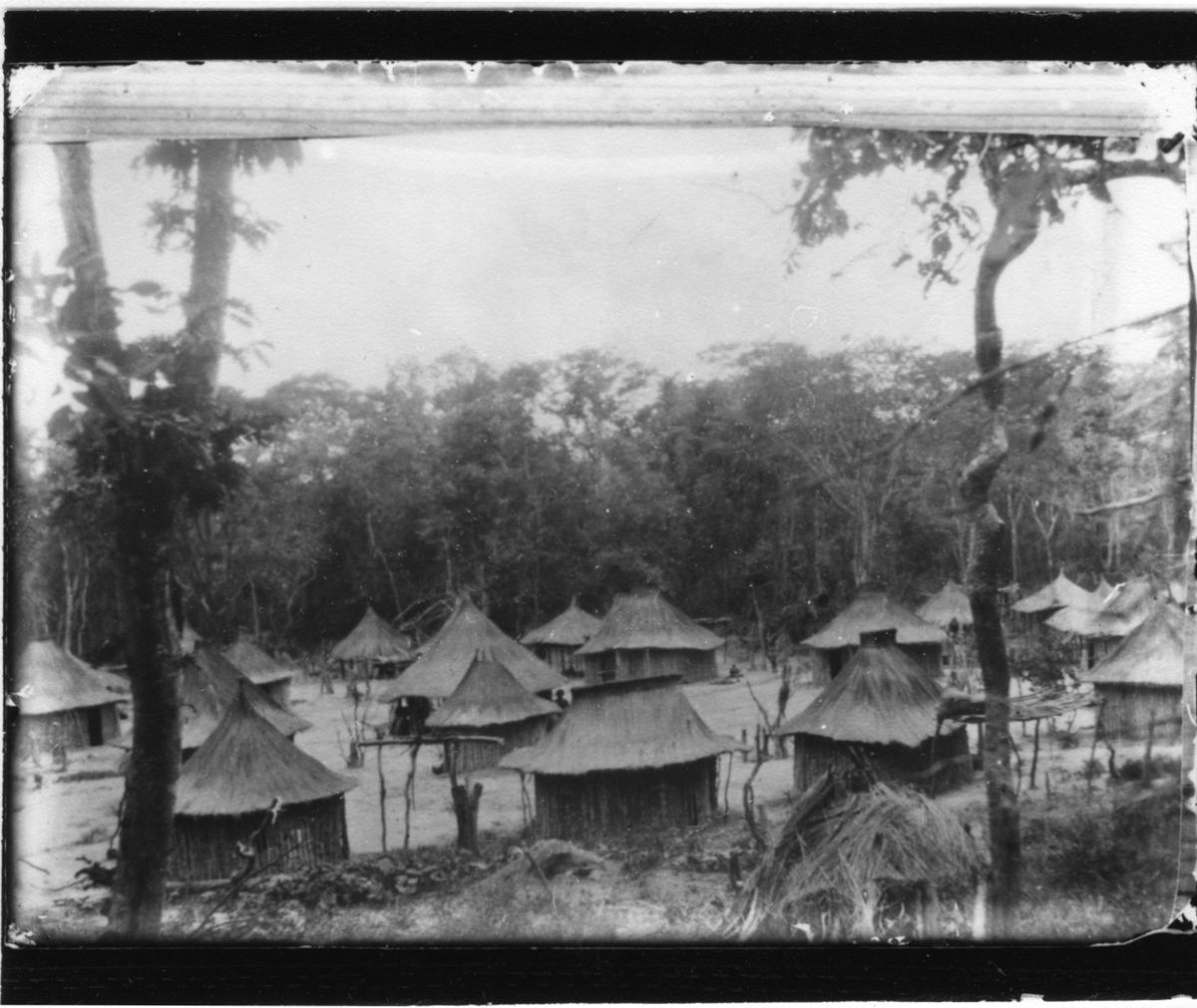 'Diverse fotografier från bl.a. dåvarande Nordrhodesia, nu Zambia, tagna av Konsul Magnus Leijer. :: :: Vy över by av hyddor, runt omkring dem är skog.'