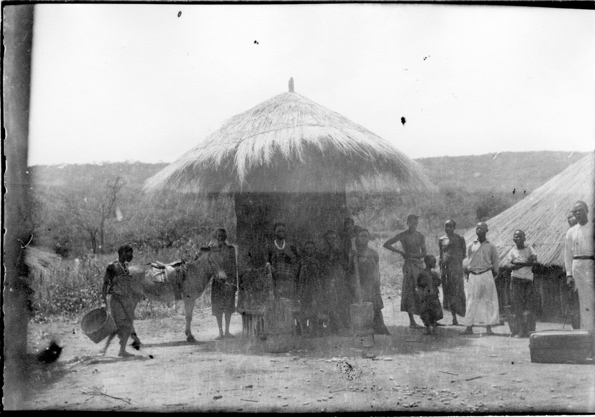 'Diverse fotografier från bl.a. dåvarande Nordrhodesia, nu Zambia, tagna av Konsul Magnus Leijer. :: :: En grupp kvinnor, män och barn stående framför en mindre cirkelformad byggnad, en man med en åsna, i bakgrunden är ytterligare byggnad och berg synligt.'