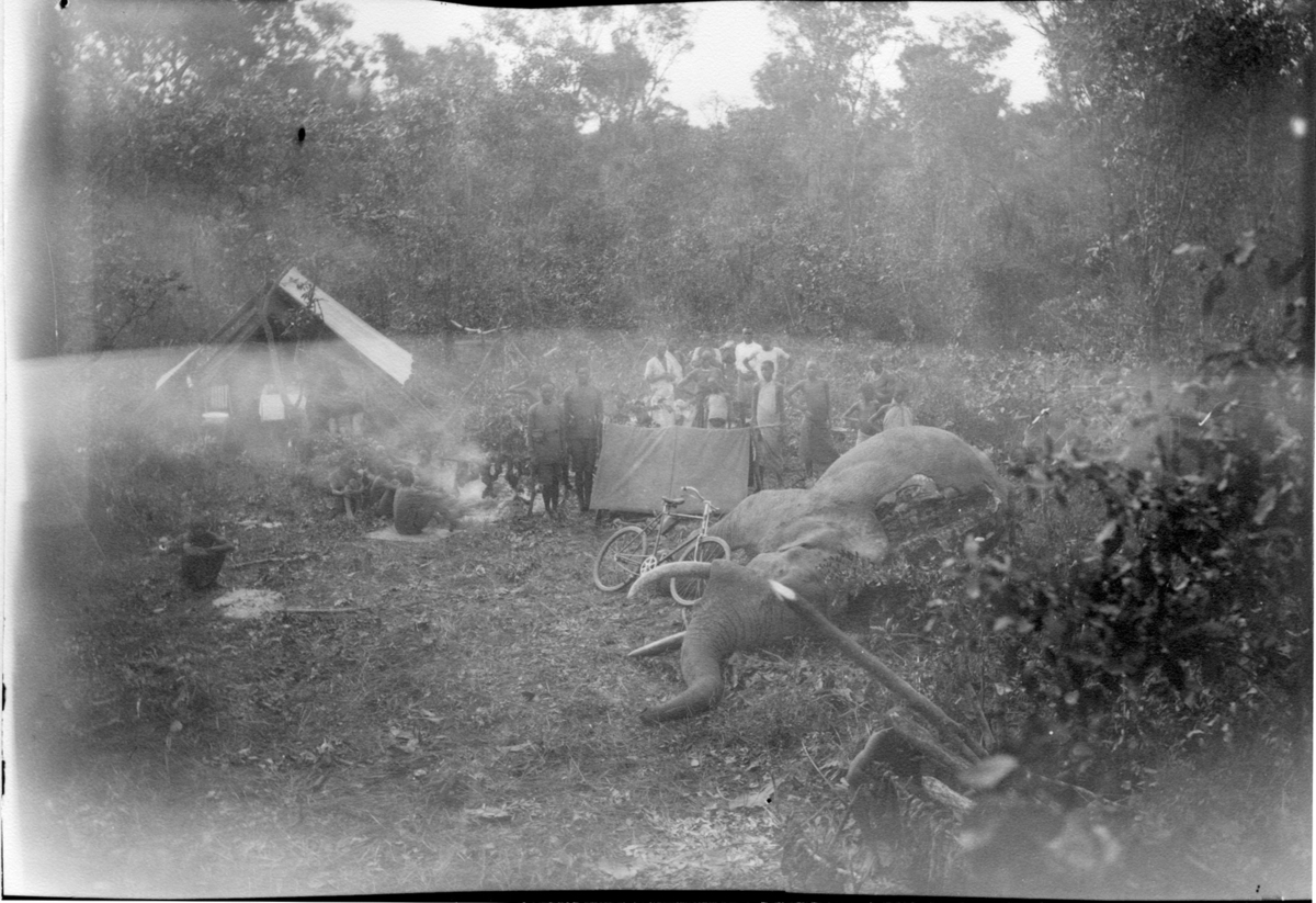 Titel: 'Diverse fotografier från bl.a. dåvarande Nordrhodesia, nu Zambia, tagna av Konsul Magnus Leijer. :: :: En fälld elefant liggande med en cykel lutad mot ett av benen, bredvid kroppen är en lägerplats och en grupp människor står, samt sitter vid en eld.'