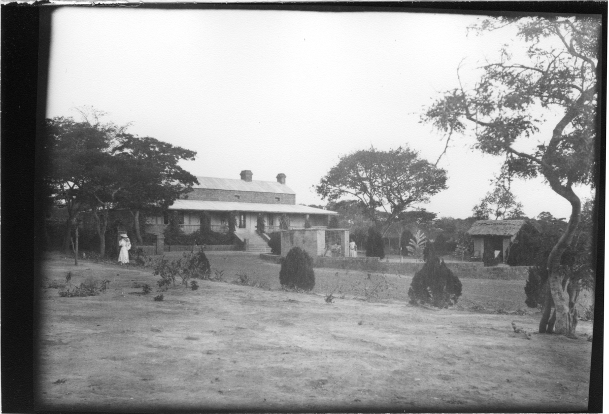 'Diverse fotografier från bl.a. dåvarande Nordrhodesia, nu Zambia, tagna av Konsul Magnus Leijer. :: :: Vy över tegelbyggnad med diverse småbyggnader omkring, samt trädgård, i denna står 1 st man, bland träden går 1 st kvinna med bebis i famnen.'