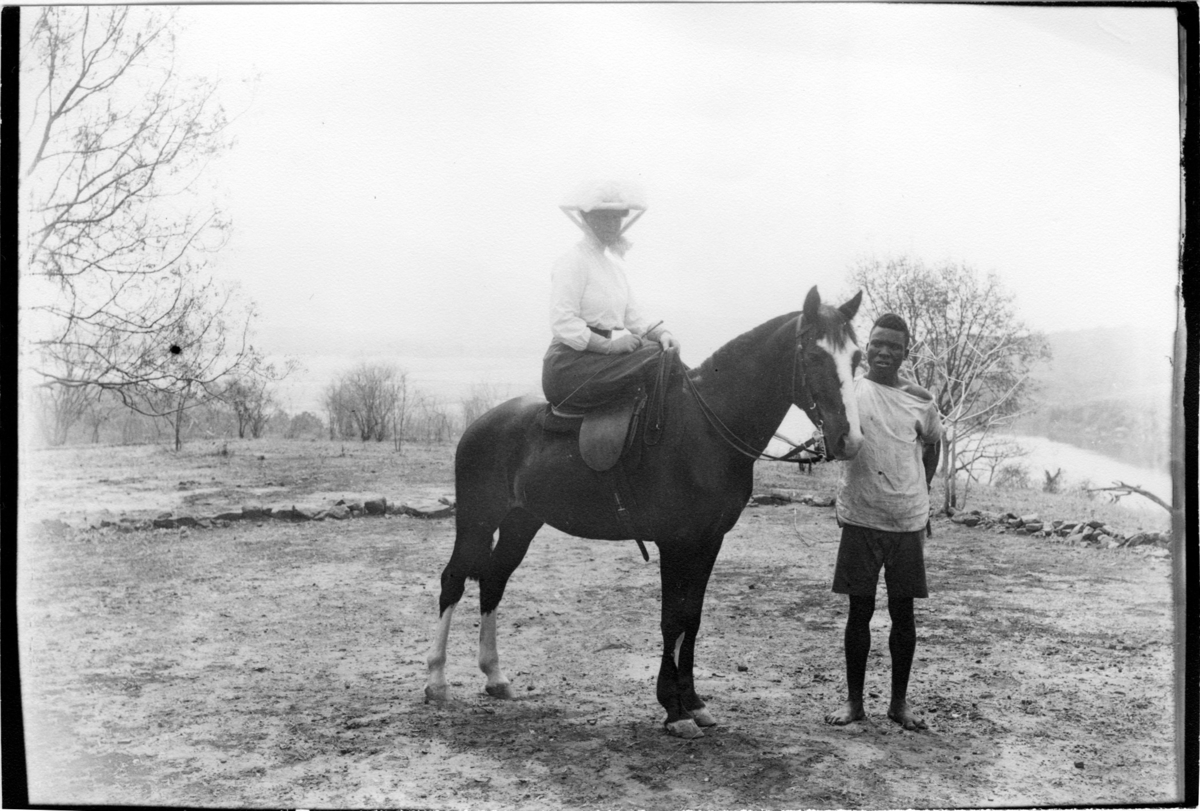 'Diverse fotografier från bl.a. dåvarande Nordrhodesia, nu Zambia, tagna av Konsul Magnus Leijer. :: :: 1 st man står vid huvudändan av en häst på vilken 1 st kvinna sitter, hästen fotograferad från sidan, I bakgrunden är vatten och träd synliga.'