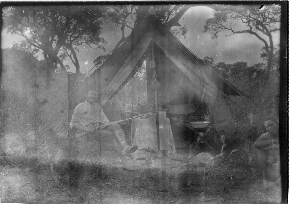 'Diverse fotografier från bl.a. dåvarande Nordrhodesia, nu Zambia, tagna av Konsul Magnus Leijer. :: :: 1 st man med gevär sittande på en stol utanför ett öppet tält. I förgrunden sitter 1 st man på marken. Mellan dem ligger 3 st döda djur.'