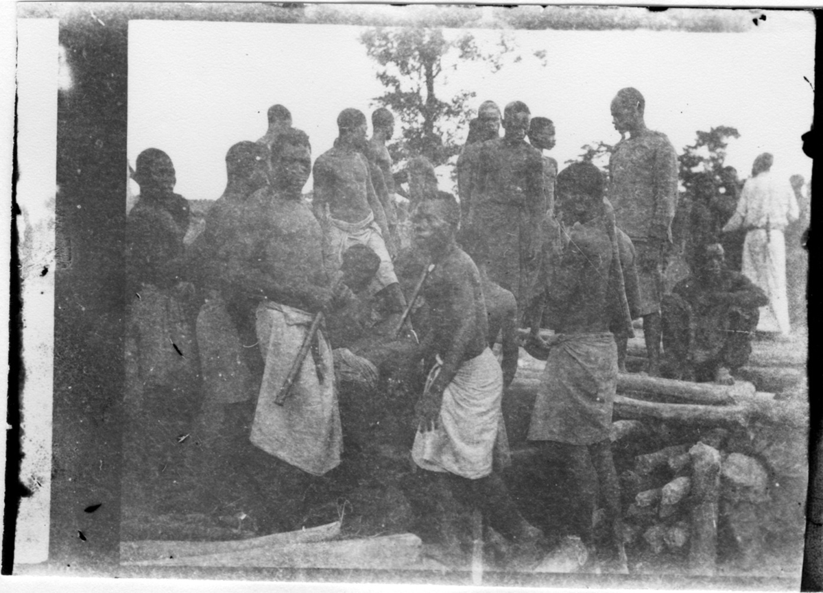 'Diverse fotografier från bl.a. dåvarande Nordrhodesia, nu Zambia, tagna av Konsul Magnus Leijer. :: :: Ett 20-tal män stående eller sittande kring en virkeshög.'