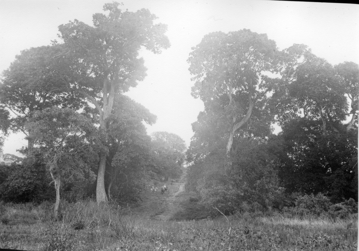 'Diverse fotografier från bl.a. dåvarande Nordrhodesia, nu Zambia, tagna av Konsul Magnus Leijer. :: :: Vy över väg gående genom höga träd, fotograferade från avstånd är en man till häst och en kvinna i en vagn dragen av en häst samt en gående person synliga.'