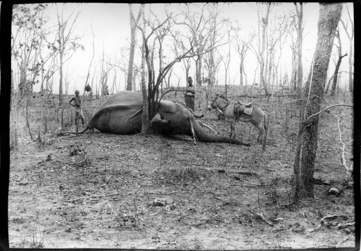 'Diverse fotografier från bl.a. dåvarande Nordrhodesia, nu Zambia, tagna av Konsul Magnus Leijer. :: :: En fälld elefant liggande på sidan, fotograferad från ryggen. Bakom står 2 män, vid sidan står en åsna. Ett gevär står lutat mot elefantens huvud.'