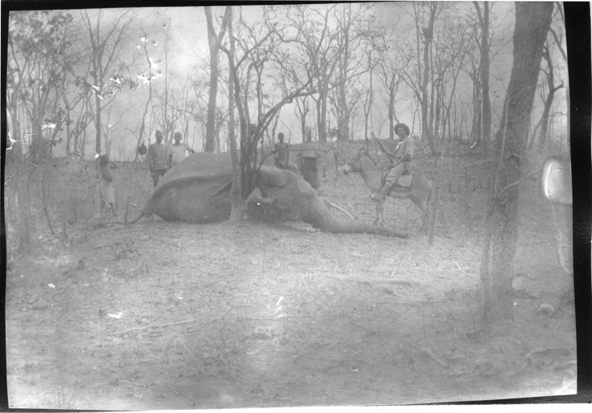 'Diverse fotografier från bl.a. dåvarande Nordrhodesia, nu Zambia, tagna av Konsul Magnus Leijer. :: :: En fälld elefant liggande på sidan, fotograferad från ryggen. Bakom står 6 män/pojkar, vid sidan sitter en man på en åsna, med gevär i handen.'