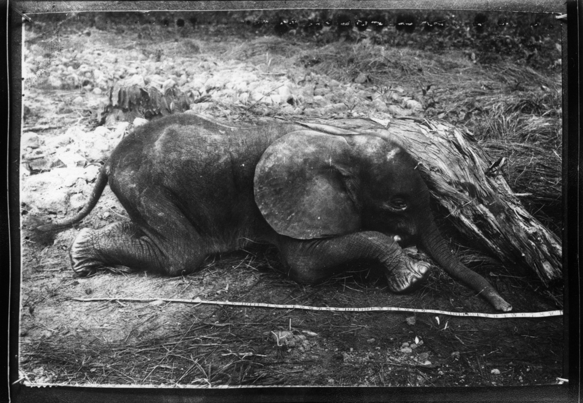 'Diverse fotografier från bl.a. dåvarande Nordrhodesia, nu Zambia, tagna av Konsul Magnus Leijer. :: :: En fälld elefantunge liggande på marken, bredvid kroppen är ett måttband utlagt. Fotograferad från nära håll.'