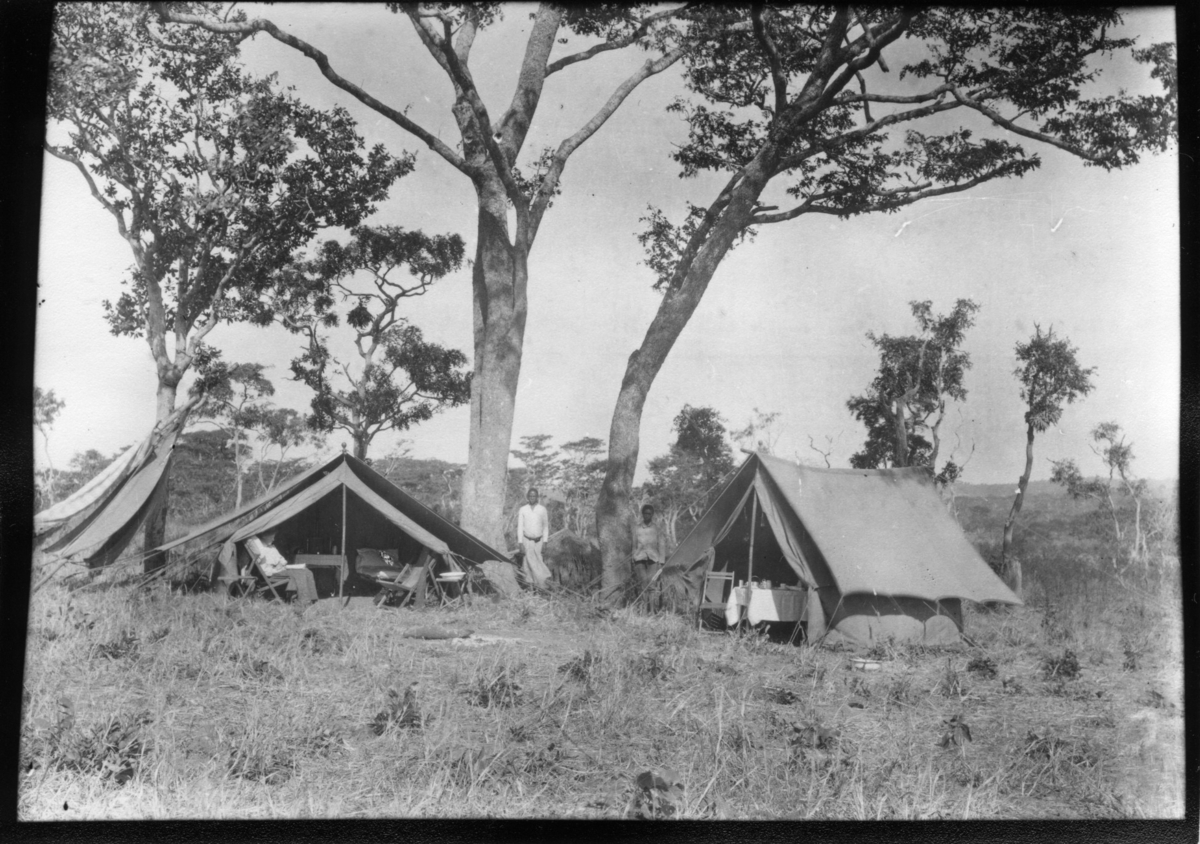 'Diverse fotografier från bl.a. dåvarande Nordrhodesia, nu Zambia, tagna av Konsul Magnus Leijer. :: :: 1 person sittande läsande i ett tält, utanför står 2 män, på andra sidan dem, finns ytterligare ett tält. I bakgrunden gräs och träd.'