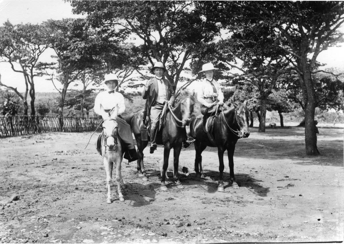 'Diverse fotografier från bl.a. dåvarande Nordrhodesia, nu Zambia, tagna av Konsul Magnus Leijer. :: :: En kvinna och en man sittande på en häst, ytterligare en kvinna sittande på en åsna. I bakgrunden är staket och träd synliga.'