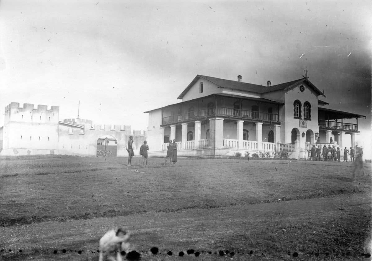 'Diverse fotografier från bl.a. dåvarande Nordrhodesia, nu Zambia, tagna av Konsul Magnus Leijer. :: :: En större vit byggnad, mur utgår från denna, framför den en öppen plats med flertal människor.'