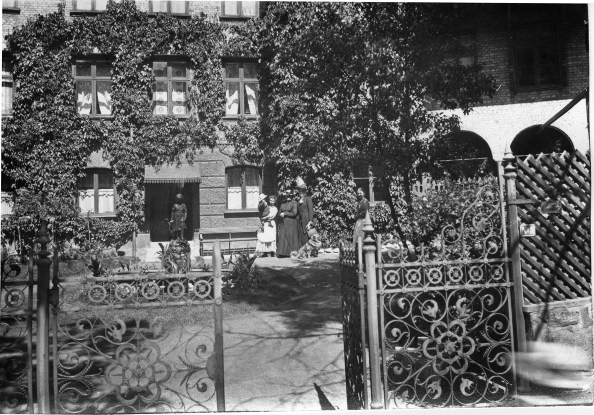 'Diverse fotografier från bl.a. dåvarande Nordrhodesia, nu Zambia, tagna av Konsul Magnus Leijer. :: :: Vy över gård mellan stora stenhus, med sirlig grind i förgrunden. På gården står fyra kvinnor och ett barn samt en hund, i mitten står en fontän, grönska.'