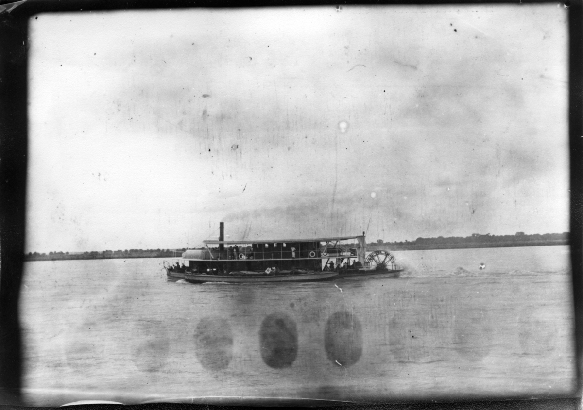 'Diverse fotografier från bl.a. dåvarande Nordrhodesia, nu Zambia, tagna av Konsul Magnus Leijer. :: :: Ett hjulfartyg fotograferad i färd på vatten, på däck är människor synliga, dock fotograferat från avstånd.'