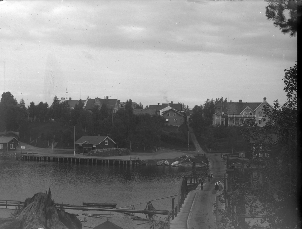 'Bildtext: ''Färgbron från Åkerolandet.'' :: Vy med bro över älv, vattendrag. På andra sidan hus och små båtar. Människor på bron. :: :: Ingår i serie med fotonr. 5223:1-13. Se även fotonr. 5231:1-11, 5232:1-8 och 5234:1-12.'