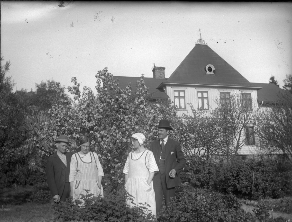 'Bildtext: ''Öfveråsgatan nr. 12.'' :: Vy med 2 kvinnor och 2 män i trädgården, i bakgrunden ett hus. Klädsel. Trädgårdsväxter, hatt. :: :: Ingår i serie med fotonr. 5224:1-13.'