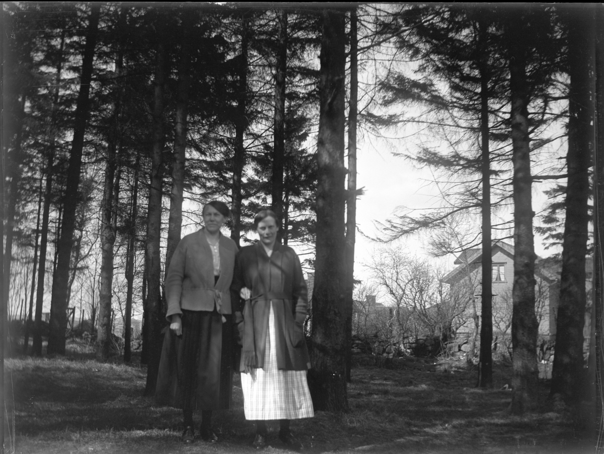 'Bildtext: ''Hulda och Ellen.'' :: 2 kvinnor stående i granskog, hus och stenmur skymtar i bakgrunden. Klädsel. :: :: Ingår i serie med fotonr. 5224:1-13.'