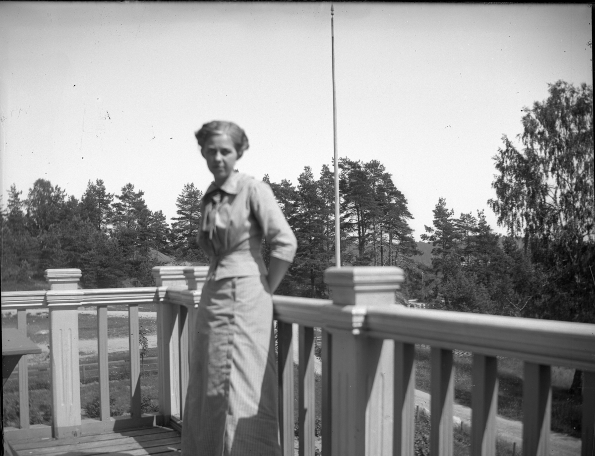 'Bildtext: ''Olga.'' :: 1 kvinna stående på verandan till ett hus, vy ut mot träd och flaggstång. :: :: Ingår i serie med fotonr. 5225:1-18. Se även fotonr. 5230:1-11.'