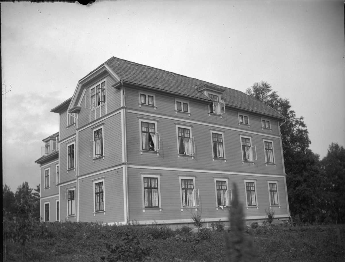 'Bildtext: ''Pensionat Mühlbeck.'' :: Vy med pensionatsbyggnaden. Vädring pågår, många fönster öppna, 1 kvinna står i ett av fönstren. :: :: Ingår i serie med fotonr. 5225:1-18. Se även fotonr. 5230:1-11.'