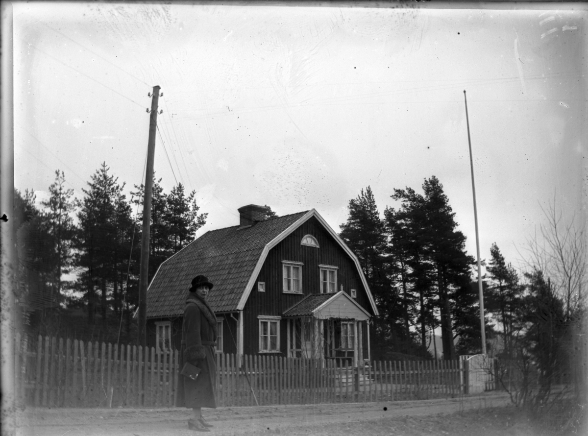 'Vy med 1 hattklädd kvinna stående framför staketet till 1 trähus med veranda och flaggstång. Klädsel. :: :: Ingår i serie med fotonr. 5226:1-11.'