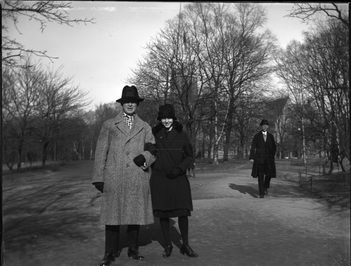 '1 man och 1 kvinna arm i arm, stående i en park. I bakgrunden ytterligare en hattklädd man på grusgången. I bakgrunden skymtar byggnad, ev. kyrka. :: :: Ingår i serie med fotonr. 5227:1-9.'