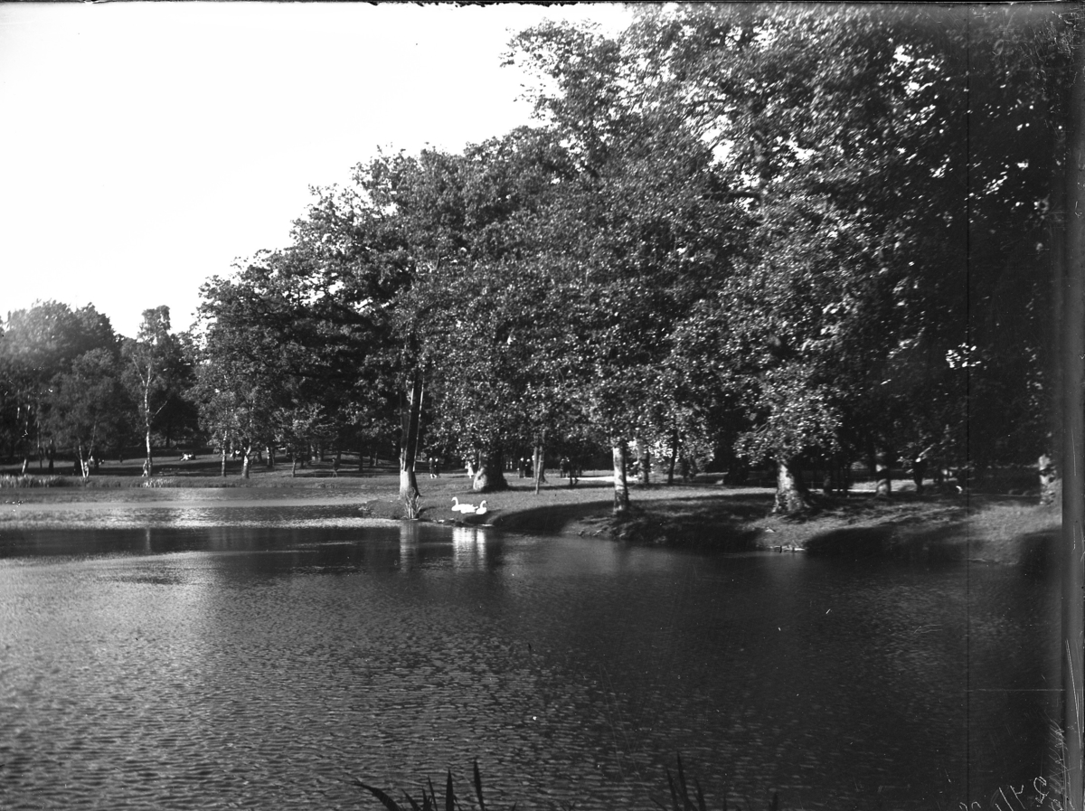 'Vy med fågeldamm i förgrunden och på grusgång invid går människor. I bakgrunden träd. I en park. :: :: Ingår i serie med fotonr. 5227:1-9.'