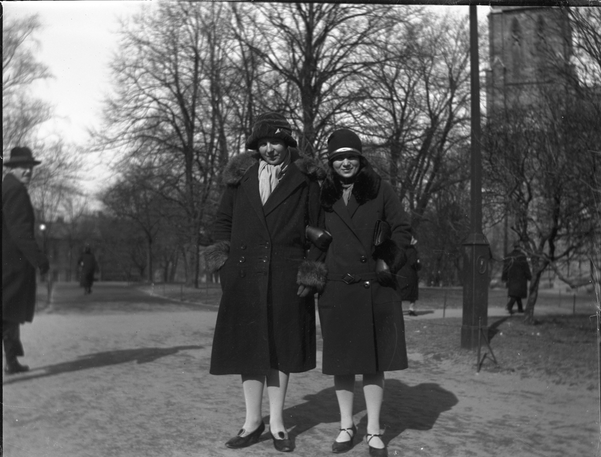 'Vy med 2 kvinnor arm i arm, iklädda kappa, hatt och väska. Stående på grusgång i en park. Gatlykta. I bakgrunden ev. en kyrka. Till vänster skymtar en man. :: :: Ingår i serie med fotonr. 5227:1-9.'