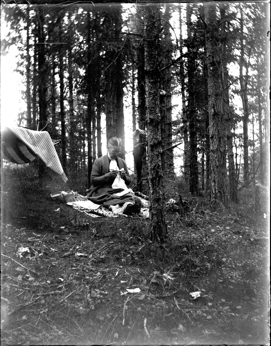 'Bildtext: ''Albertina i skogen.'' :: 1 kvinna sitter på marken på en filt och virkar. Granar. Handarbete. :: :: :: Ingår i serie med fotonr. 5230:1-11, se även fotonr. 5229:1-13'