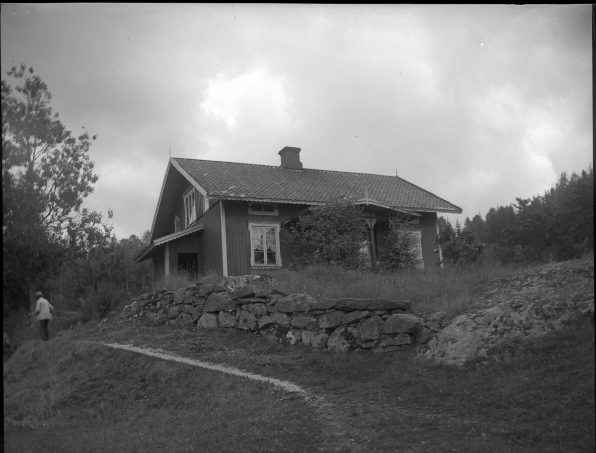 'Bildtext: ''Krappsätern.'' :: Vy med ett trähus och stenmur. 1 person gående på stig. Stengärdesgård. :: :: Ingår i serie med fotonr. 5230:1-11, se även fotonr. 5229:1-13'