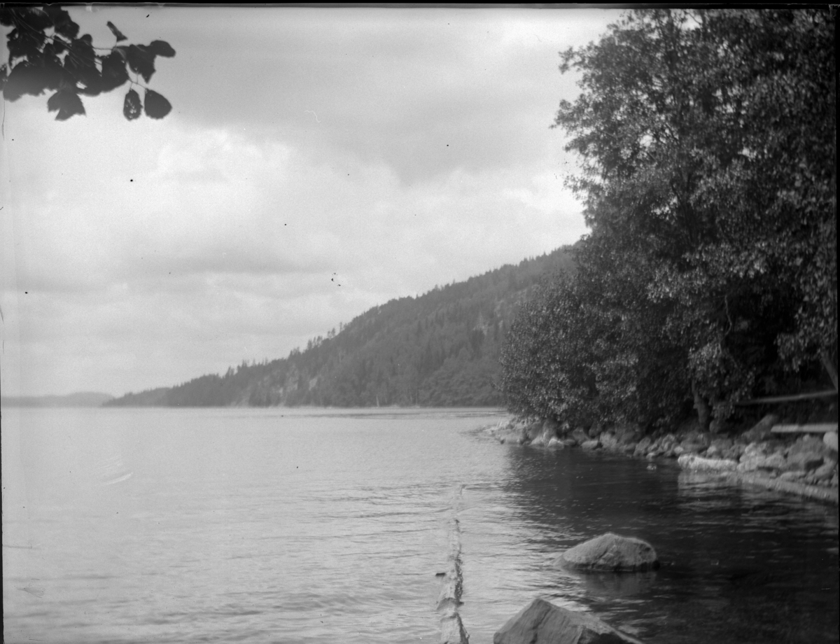 'Bildtext: ''Strand vid Krappsäter.'' :: Vy övver sjö och strandkant, trädbevuxen. :: :: Ingår i serie med fotonr. 5230:1-11, se även fotonr. 5229:1-13'