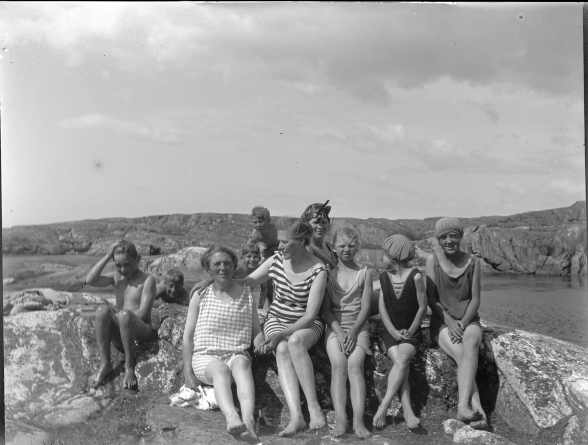 'Gruppbild med badklädda kvinnor, barn, flickor, pojkar. Gruppen iklädda badkläder och sittande på berghäll vid havet. :: :: Ingår i serie med fotonr. 5236:1-11.'