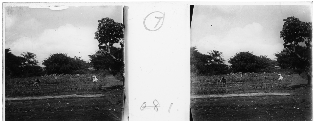 'Vy över fält med någon form av odling (trädgård). 3 personer jobbar i odlingen. :: Enligt text till fotot: ''A.M.´s garden.'' (A.M.´s trädgård.) :: :: Ingår i en serie med fotonr. 5237:1-16. Se även fotonr. 5238:1-18, 5239:1-18 och 5240:1-17, 5241:1-18.'
