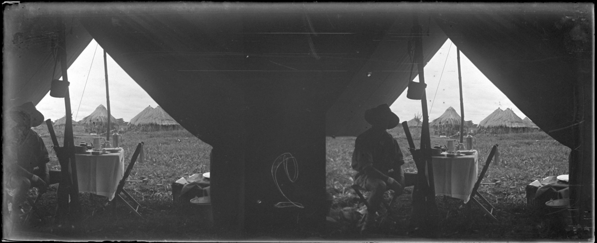 'Vy inifrån Magnus Leyers tält och ut med bord och fällstol i tältöppningen. 1 man sitter vid bordet. Toppiga hyddor och va 15 människor en bit bort. :: Enligt text till fotot: ''Looking out from M.L.´s tent''. (Tittande ut från M.L.´s tält.) :: :: Ingår i en serie med fotonr. 5238:1-18. Se även fotonr. 5237:1-16, 5239:1-18 och 5240:1-17, 5241:1-18. :: :: Vyer, resa till Beira, båtar, stadsmiljö. :: Nr 2.'