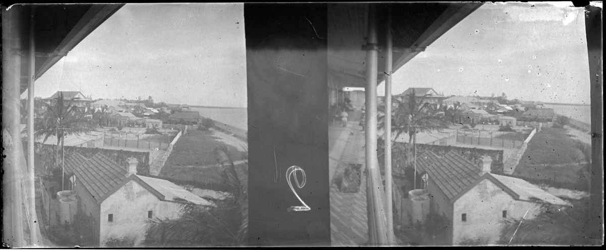 'Vy med hus och hav, taget från balkong på hotell Savoy. :: Enligt text till fotot: ''Beira, from balcony, Savoy Hotel.'' (Beira, sedd från balkong, Savoy Hotell.) :: :: Ingår i en serie med fotonr. 5238:1-18. Se även fotonr. 5237:1-16, 5239:1-18 och 5240:1-17, 5241:1-18.'