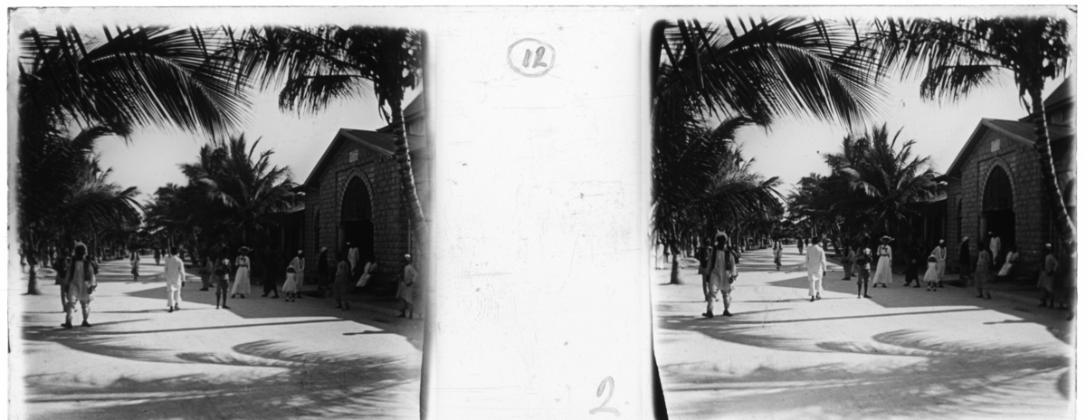 'Gående människor på gata med allé av palmträd. Enligt text till fotot: ''Native markets, avenue.'' (lokal marknad, aveny.) :: :: Ingår i en serie med fotonr. 5238:1-18. Se även fotonr. 5237:1-16, 5239:1-18 och 5240:1-17, 5241:1-18.'