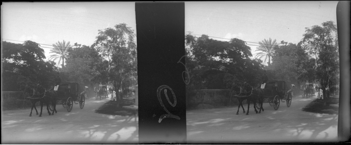 'Väg med 2 ekipage, vagnar dragna av 2 hästar. Enligt text till fotot: ''Sultan´s carriages exercising.'' (Sultanens ekipage övar.) :: :: Ingår i en serie med fotonr. 5238:1-18. Se även fotonr. 5237:1-16, 5239:1-18 och 5240:1-17, 5241:1-18.'
