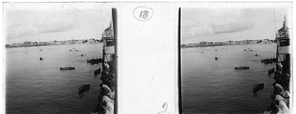 'Människor står vid relingen på en stor båt. Invid ett antal mindre båtar med människor. Vy med stadsbebyggelse på avstånd. Enligt text till fotot: ''View of town from the streamer.'' (Vy över staden sett från båten.) :: :: Ingår i en serie med fotonr. 5238:1-18. Se även fotonr. 5237:1-16, 5239:1-18 och 5240:1-17, 5241:1-18.'
