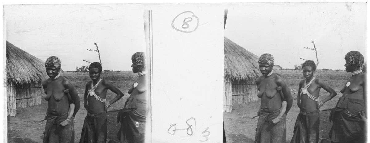 '2 kvinnor och 1 flicka. En av kvinnorna med ett litet barn på ryggen. Iklädda höftbeklädnader och halssmycken. I bakgrunden hydda och öppet fält. :: Enligt text till fotot: ''Soli, two women and girl.'' (Soli, 2 kvinnor och flicka.) :: :: Ingår i en serie med fotonr. 5239:1-18. Se även fotonr. 5237:1-16, 5238:1-18 och 5240:1-17, 5241:1-18.'