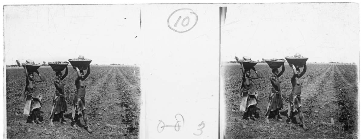 '3 kvinnor med fyllda korgar på huvuden. 1 av kvinnorna bär även ett barn på ryggen, iklädda höftbeklädnader. På fält. :: Enligt text till fotot: ''Soli three women, with baskets.'' (Soli, 3 kvinnor med korgar.) :: :: Ingår i en serie med fotonr. 5239:1-18. Se även fotonr. 5237:1-16, 5238:1-18 och 5240:1-17, 5241:1-18.'
