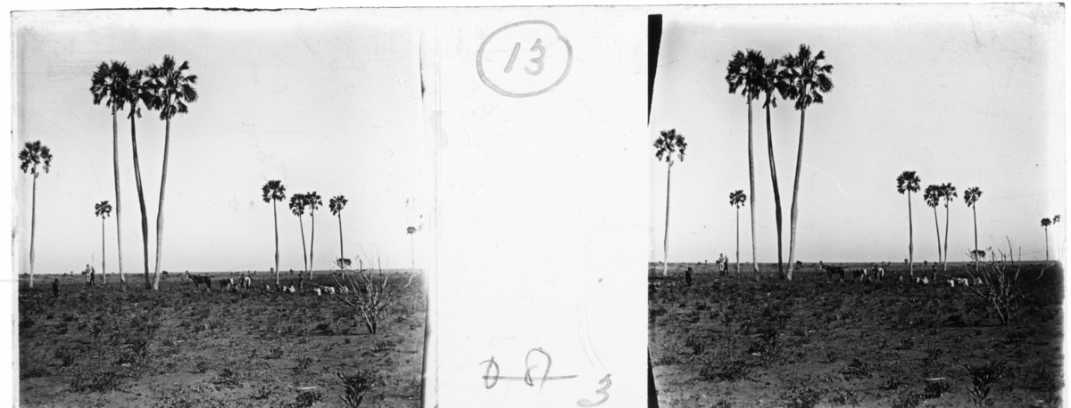 'Vy med människor och hästar bland palmer, i övrigt öppen mark. Bland människorna finns Magnus Leyer och Bruce Miller. :: Enligt text till fotot: ''200 palms, Bruce Miller and M.L.'' (''200 palmer, Bruce Miller och M.L.). :: :: Ingår i en serie med fotonr. 5239:1-18. Se även fotonr. 5237:1-16, 5238:1-18 och 5240:1-17, 5241:1-18.'