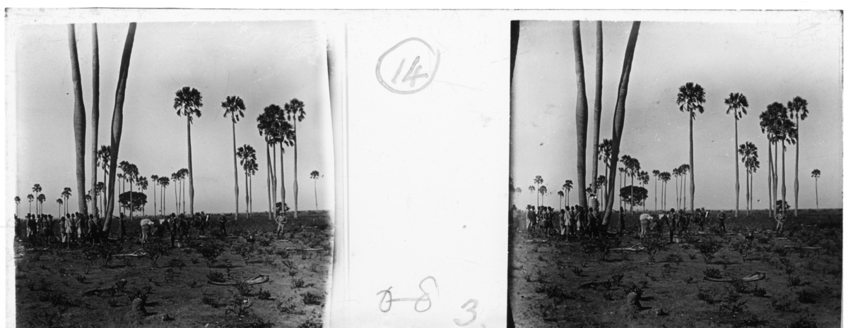 'Ca 15 personer samlade vid palmer. Palmerna har en svälld del en bit ovanför marken. Bland människorna finns Magnus Leyer och Bruce Miller. :: Enligt text till fotot: ''200 palms, Bruce Miller and M.L.'' (''200 palmer, Bruce Miller och M.L.). :: :: Ingår i en serie med fotonr. 5239:1-18. Se även fotonr. 5237:1-16, 5238:1-18 och 5240:1-17, 5241:1-18.'