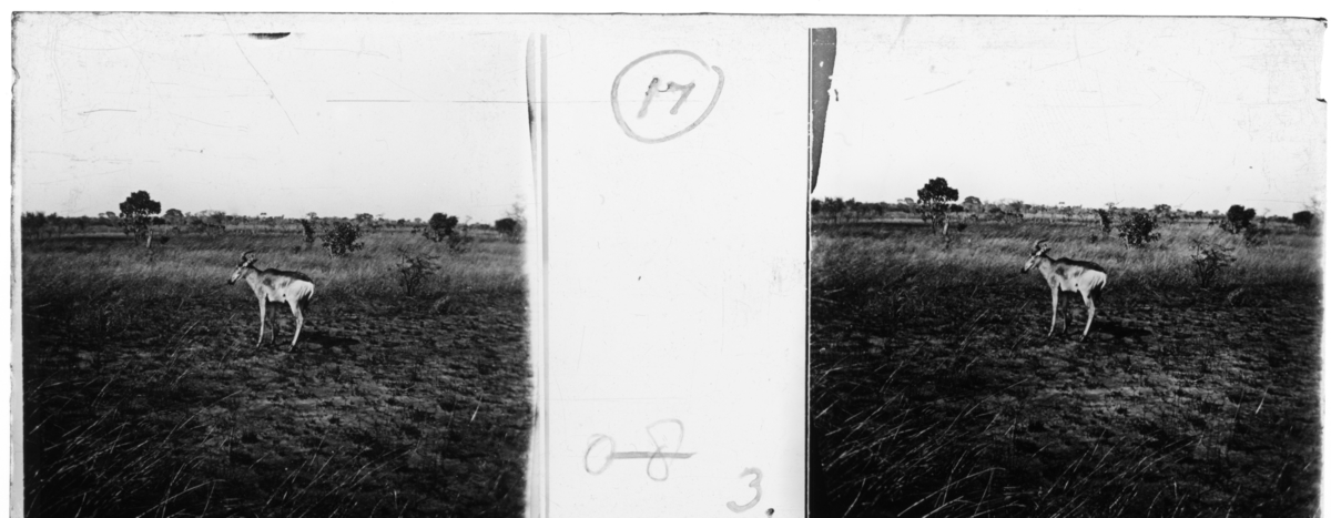'Vy med 1 hartebeest i förgrunden med :: Enligt text till fotot: ''Wounded hartebeest''. (Dödad hartebeest). Vy med savann med högt gräs och buskar, träd. :: :: Ingår i en serie med fotonr. 5239:1-18. Se även fotonr. 5237:1-16, 5238:1-18 och 5240:1-17, 5241:1-18.'