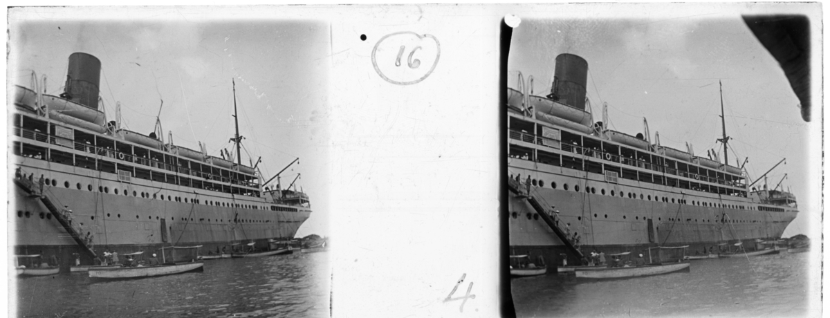 'Stor båt med ett antal mindre båtar liggande intill. Människor går uppför trappa från småbåtarna till stora båten. :: Enligt text till fotot: ''At Mombasa, from tender boat.'' (Vid Mombasa, från :: :: :: Ingår i en serie med fotonr. 5240:1-17. Se även fotonr. 5237:1-16, 5238:1-18 och 5239:1-18, 5241:1-18.'