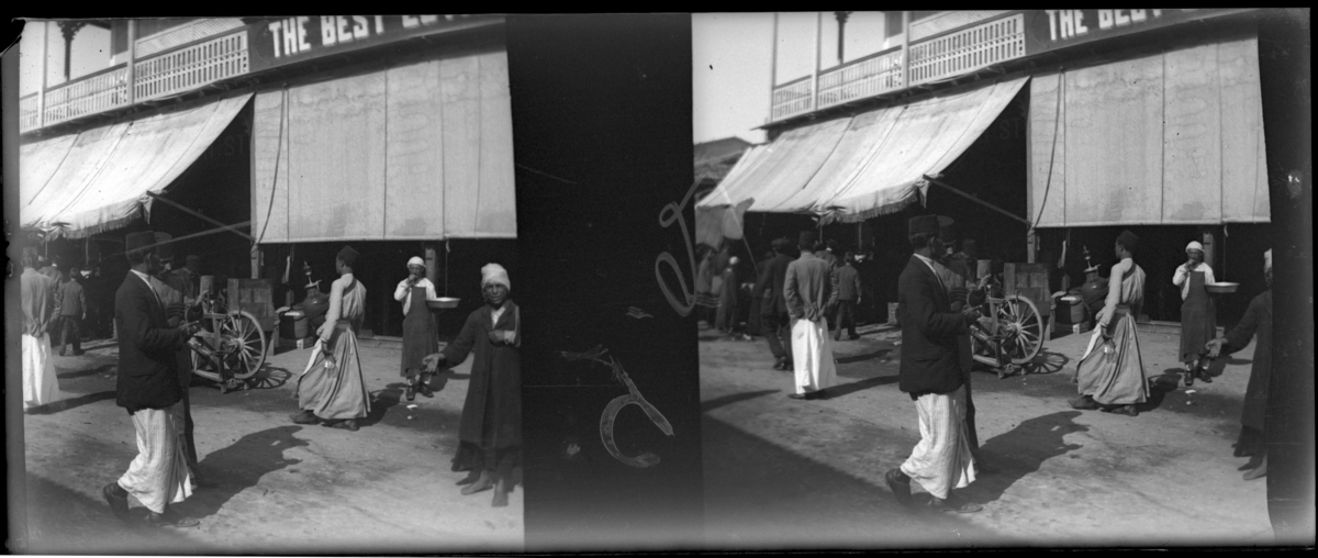 'Ca 5 personer på gata framför hus. Ett hjul synligt. :: Enligt text till fotot: ''Leomade seller and street scene.'' (Lemonadförsäljare och gatuscene.) :: :: Ingår i en serie med fotonr. 5241:1-18. Se även fotonr. 5237:1-16, 5238:1-18 och 5239:1-18, 5240:1-17.'