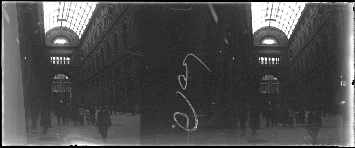 'Valvgång, med ev. glastak, mörk bild. :: Enligt text till fotot: ''Arcade Vittorio Emmanuele.'' (Valvgång Vittorio Emmanuele.) :: :: Ingår i serie med fotonr. 5242:1-17, se även hela serien med fotonr. 5237-5267.'