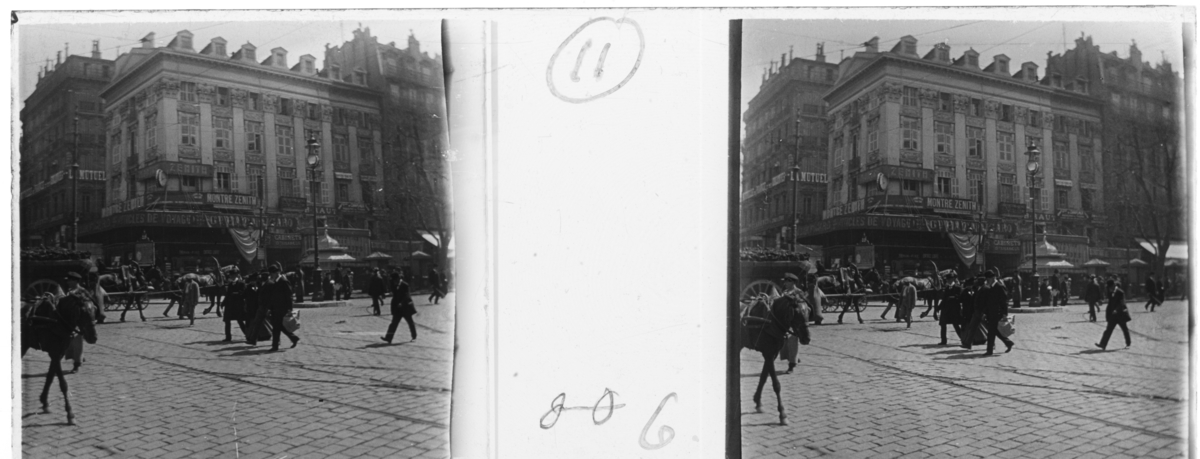 'Gata med människor, vagnar och hästar. Byggnad med text ''Montre Zenith''. Enligt text till fotot: ''Rue Noailles.'' :: :: Ingår i serie med fotonr. 5242:1-17, se även hela serien med fotonr. 5237-5267.'