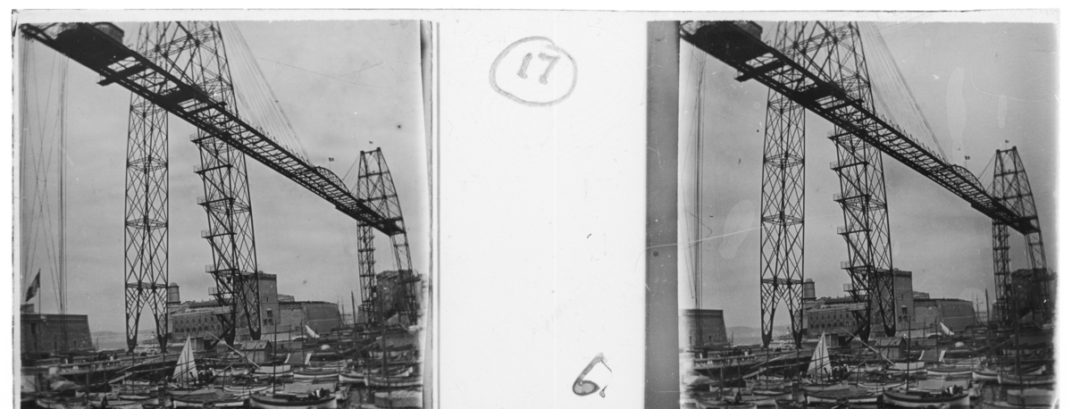 'Enligt text till fotot: ''Suspension ferry.'' :: Vy med samling mindre båtar med segel i vattnet under och kring en bro. I bakgrunden en byggnad. :: :: Ingår i serie med fotonr. 5242:1-17, se även hela serien med fotonr. 5237-5267.'