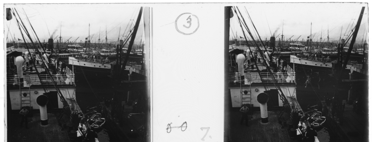 'Vy med ett antal båtar samlade i grupp, vy över däck med människor på båtdäck. :: Enligt text till fotot: ''Shipping, from Mole du Lazaret.'' ( :: :: Ingår i serie med fotonr. 5243:1-16, se även hela serien med fotonr. 5237-5267.'