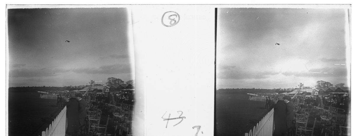'Vy över öppen mark med staket. Bakom staketet stor samling människor, åskådare, en del sittande på stolar. Tornbyggnad med skylt ''Event starters'' finns bland åskådarna, i bakgrunden byggnader. På andra sidan staketet 2 personer, vakter? Enligt text till fotot: ''Crowd of spectators.'' (Samling åskådare.) :: :: Ingår i serie med fotonr. 5243:1-16, se även hela serien med fotonr. 5237-5267.'